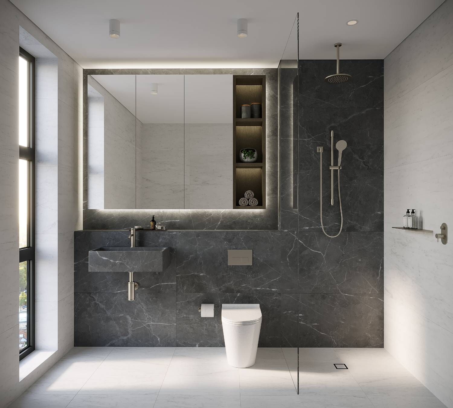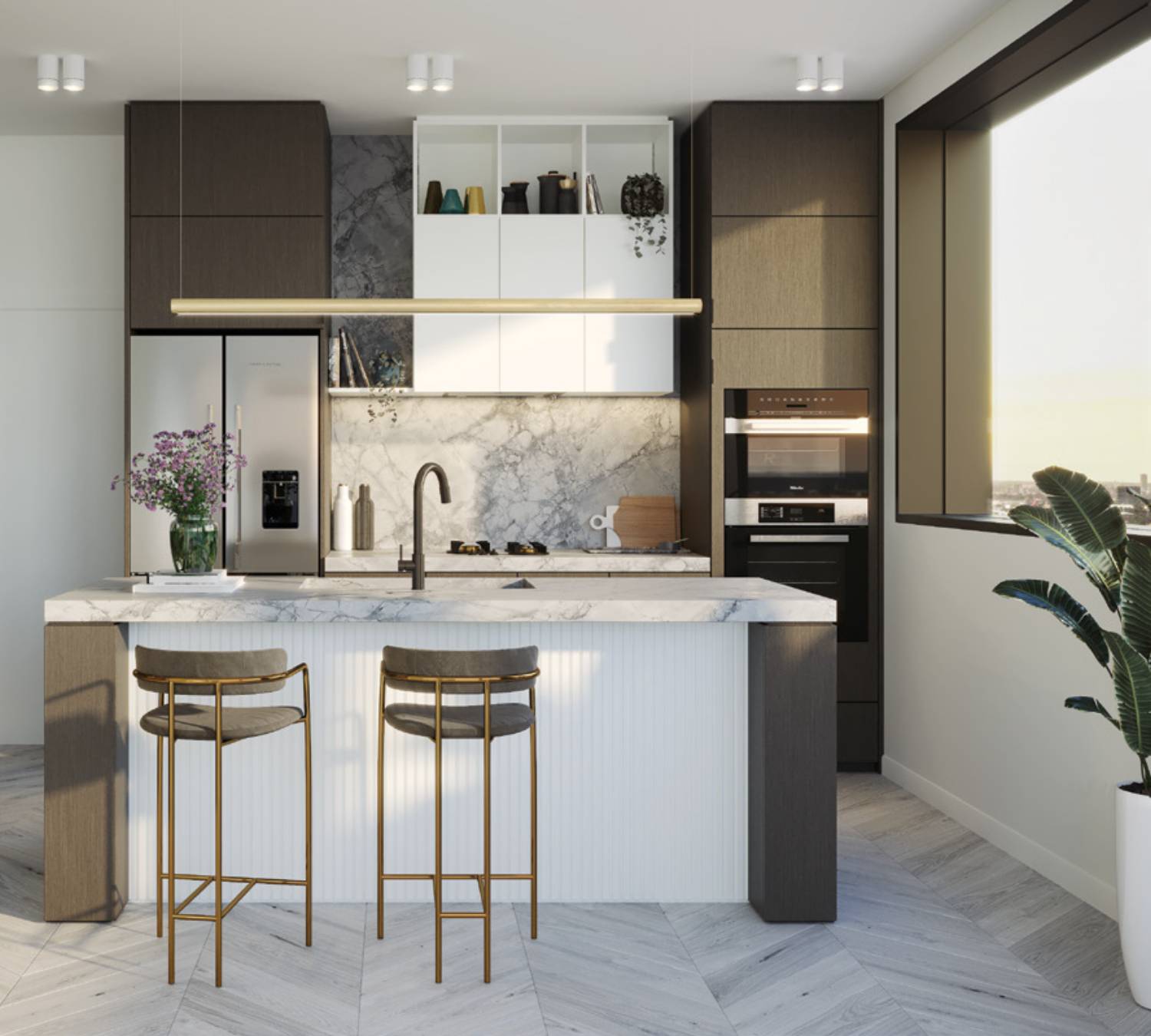 Rich in detail, the interiors have a bespoke feel, with a carefully curated palette of materials and features creating an air of modern elegance. A choice of warm and cool colour schemes allows you to personalise your space to suit your aesthetic, enhanced by engineered oak floors. A harmonious balance of form and function, kitchens fuse bold engineered stone benchtops with state-of-the-art Miele appliances and Villeroy & Boch brushed stainless steel tapware. Bathrooms marry marble-inspired porcelain tiles with brushed nickel hardware, and vanities custom-crafted exclusively for Victoria Place.